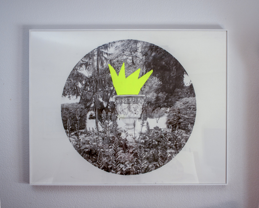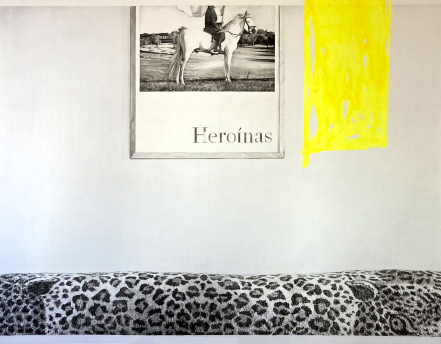 Carbón, grafito y tinta de serigrafía sobre tabla.